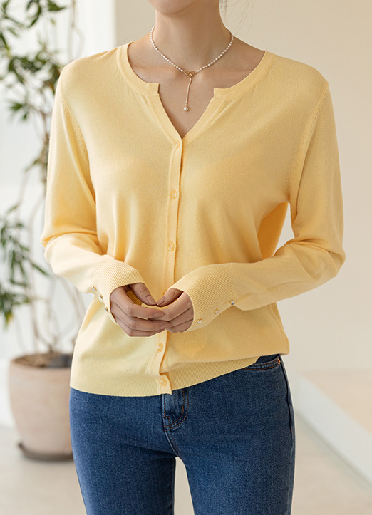 넥트임으로 페미닌한 라인이 돋보이며 소매에 비즈로 포인트를 준 가디건