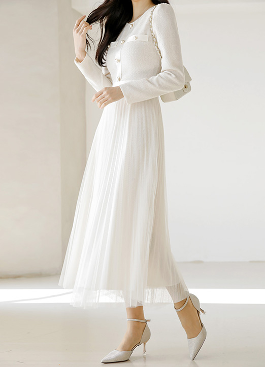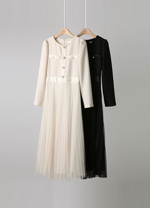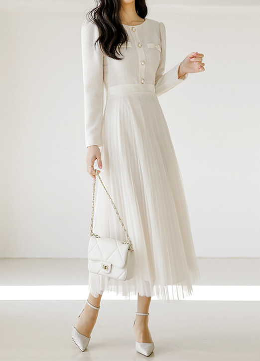 [Featuring a tweed-effect top with pearl details and a floaty tulle skirt, this dress blends structure with graceful movement.]