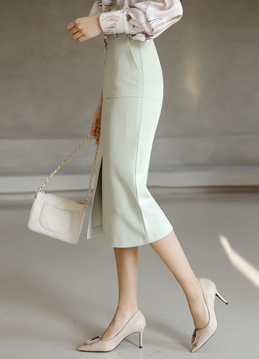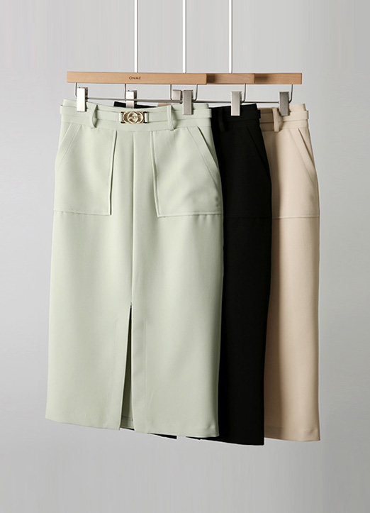 [ A structured H-line skirt with chic out-pocket details, a gold-buckle belt, and a front slit for ease and elegance.]