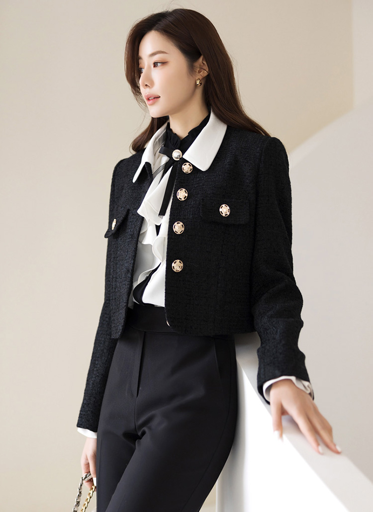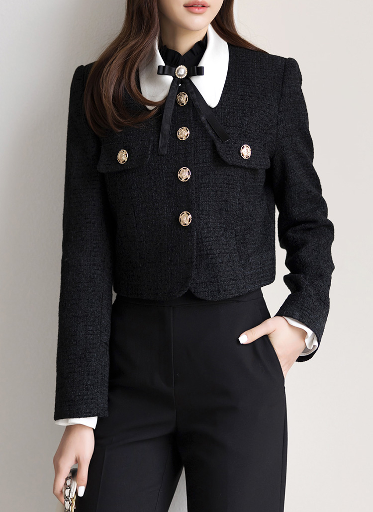 [LouisAngel] Removable Satin Collar Gold Button Tweed Jacket