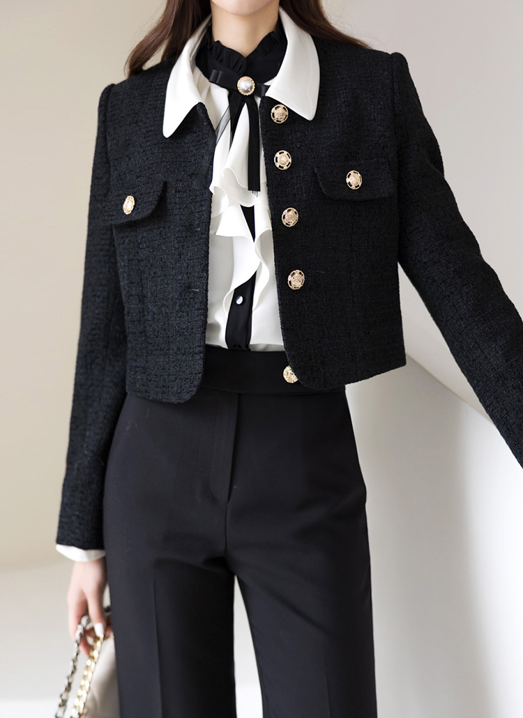 [A semi-cropped tweed jacket with a detachable satin collar and bold gold buttons, blending elegance with versatility.