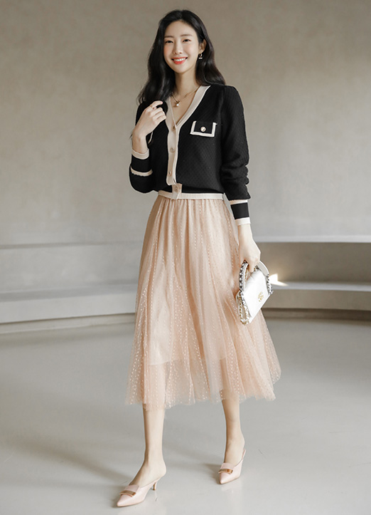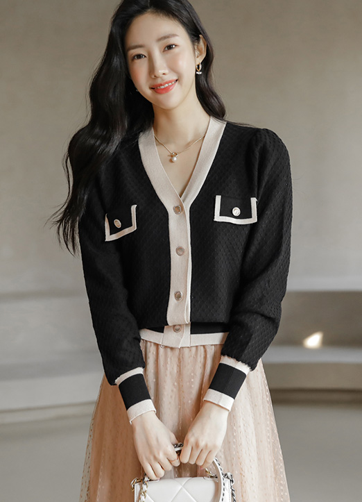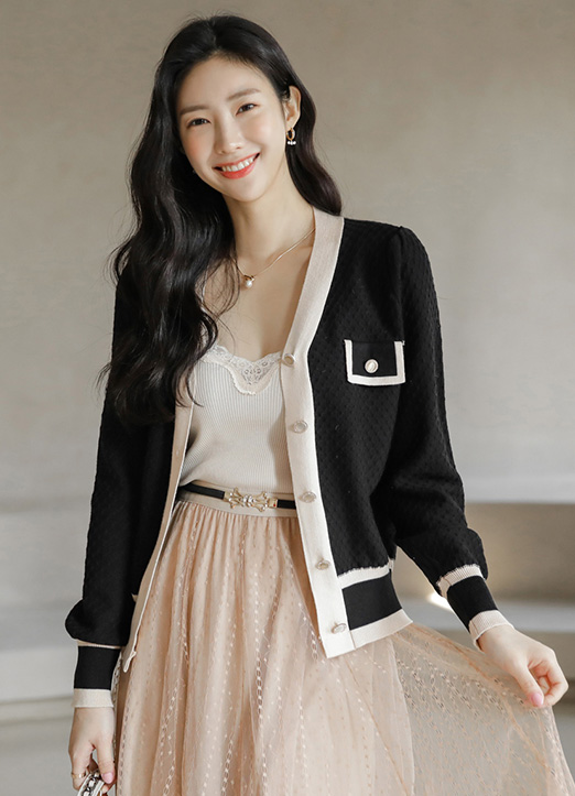 [Crafted with an intricate knit texture, soft stretch, and elegant contrast trims, perfect for layering from day to night.]
