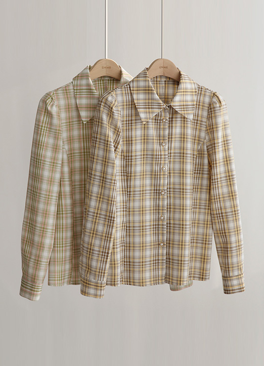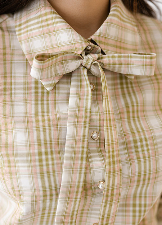 Versatile shirt featuring a charming color check print, pearl buttons, and a detachable tie set for varied styling options. Its slimming silhouette and slightly over-sized collar add an elegant touch, making it a stylish and versatile choice.]