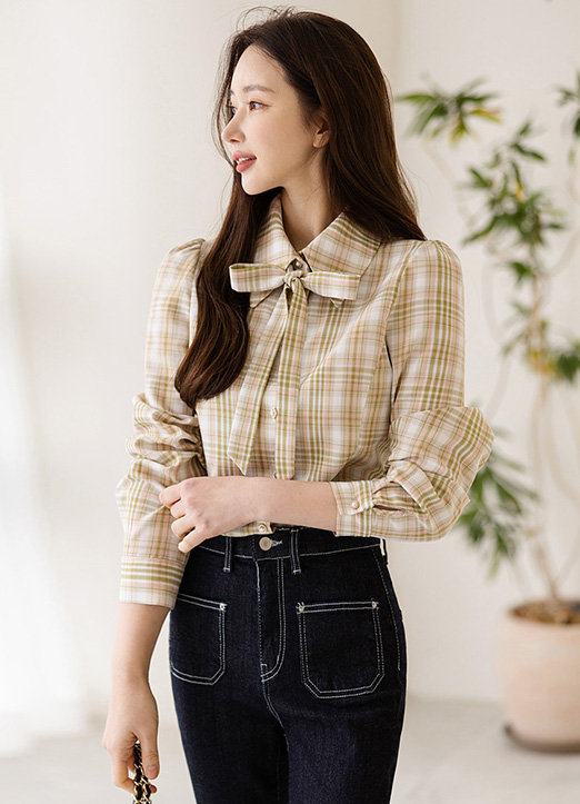 Versatile shirt featuring a charming color check print, pearl buttons, and a detachable tie set for varied styling options. Its slimming silhouette and slightly over-sized collar add an elegant touch, making it a stylish and versatile choice.]