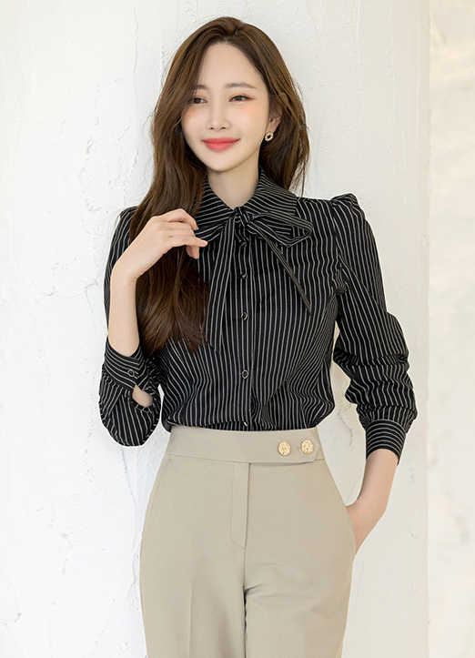 Special striped shirt featuring a slim and modern silhouette with a thin vertical stripe and princess seams for a fashionable edge. Comfortable with a slight stretch fabric and versatile styling with a bow set. Highly valuable as a wardrobe staple.]