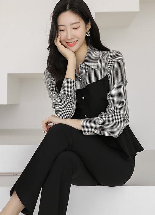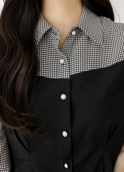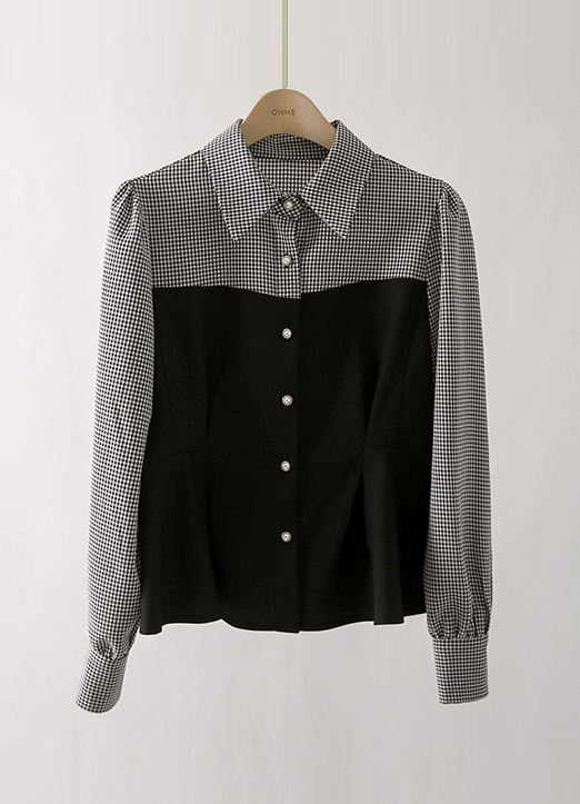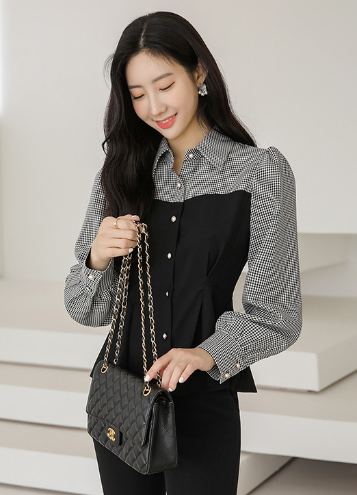 Featuring a pin-tucked peplum design that creates a feminine silhouette and a check pattern on the upper part for a casual vibe. Puff sleeves and pearl buttons add lovely details.]