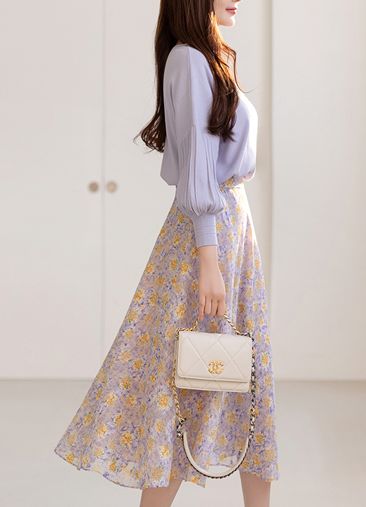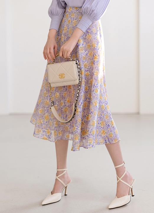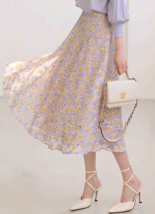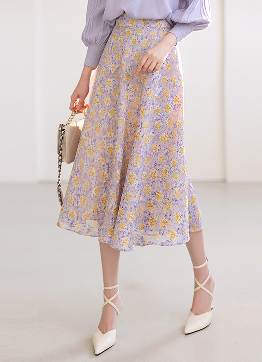 [Louis Angel] Elastic Back Waist Floral Flare Chiffon Skirt
