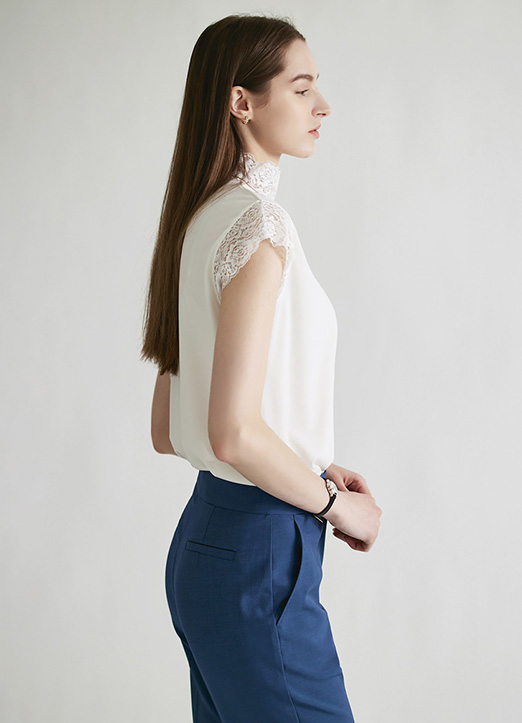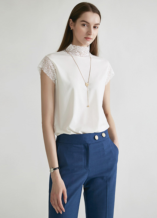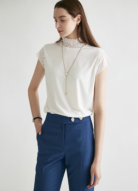 [Lightweight, fluid fabric offers a smooth feel, while lace cap sleeves and a refined high neckline add graceful detail for versatile day-to-evening wear.]