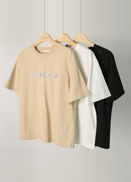깔끔한 자수 레터링과 큐빅 도트로 화사한 포인트를 준 티셔츠