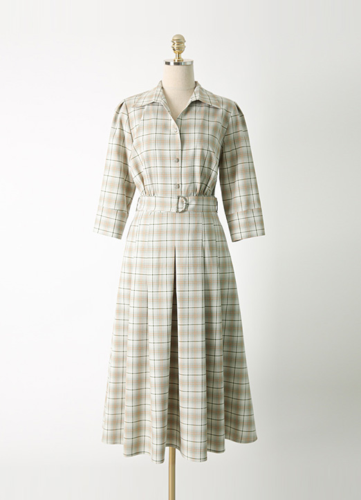 [The Onme] Self D-Ring Belted Check Pleats Dress