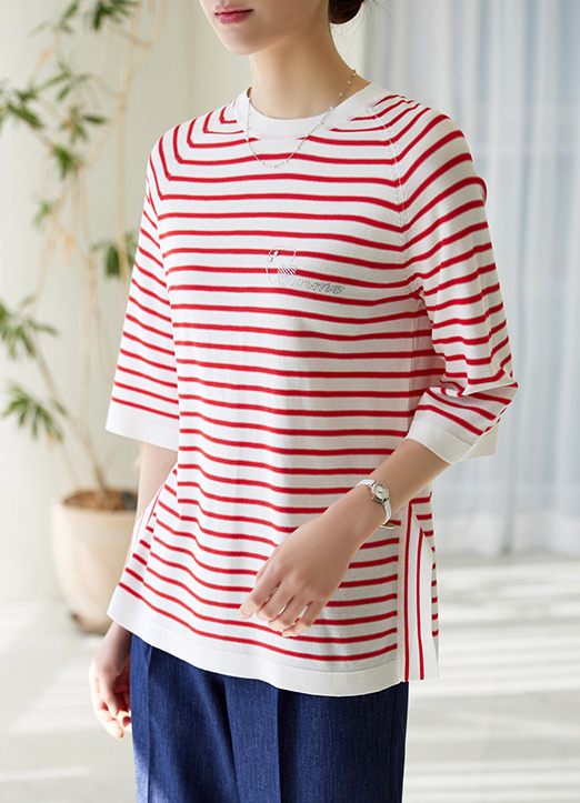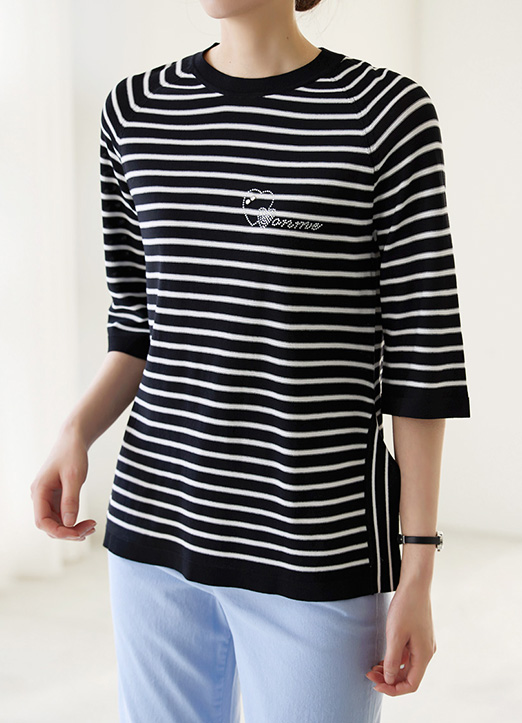 하트와 로고 레터링으로 비즈포인트를 주어 시원해 보이는 스트라이프 니트