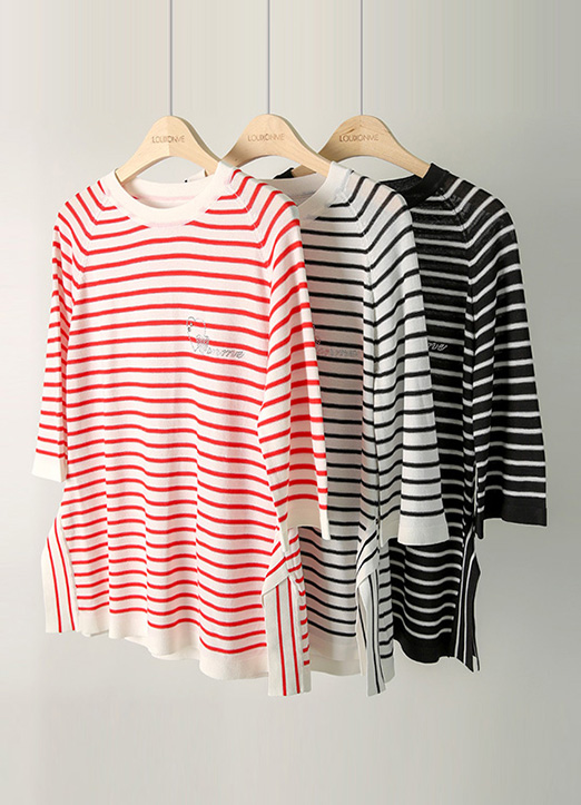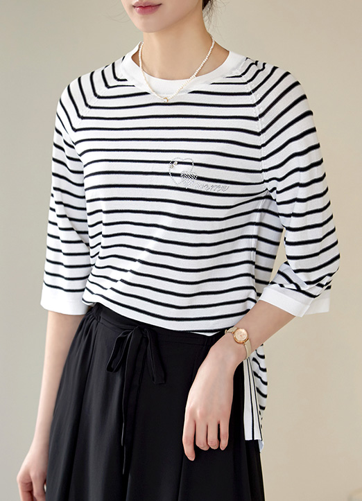 [Louis Angel] Rhinestone Lettering Side Slit Striped Knit Top