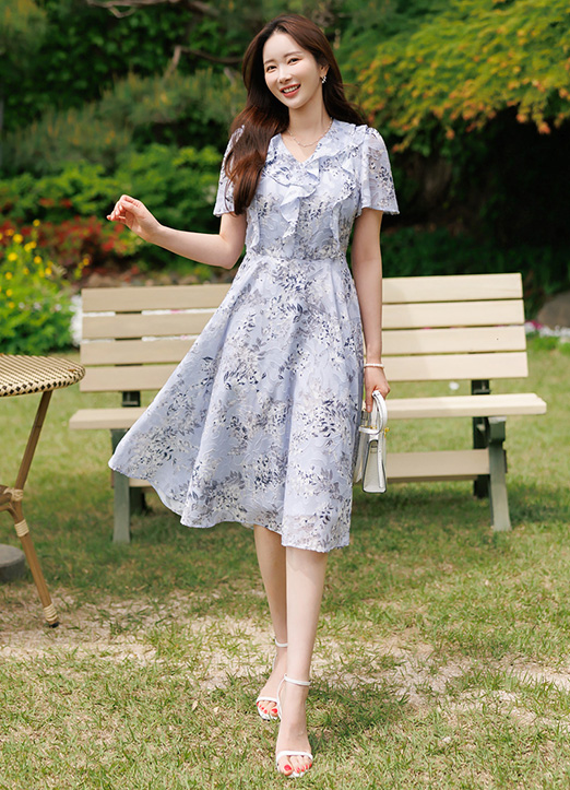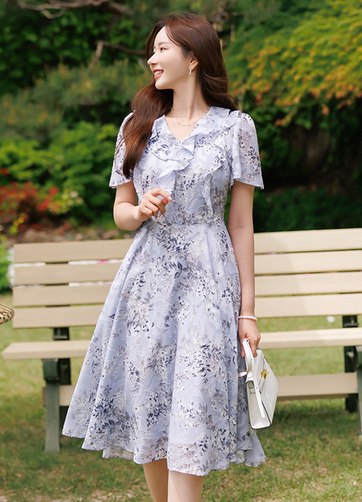 [Lovely flared dress with a subtle and sophisticated jacquard floral pattern. Ruffle details add a lovely touch from the neckline to the bust, while flared sleeves naturally cover the arm line. The soft color and romantic mood make it perfect for any occasion. ]