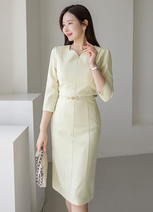 Heartneck 3/4 Sleeve Structured Slim Midi Dress w/ Belt