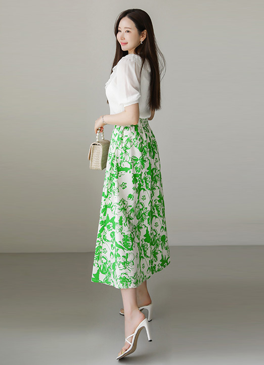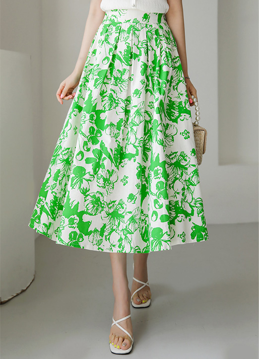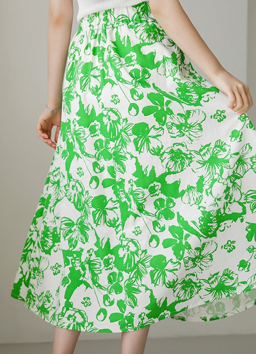 Elastic Back Waist Linen Blended Floral Pleats Flare Skirt
