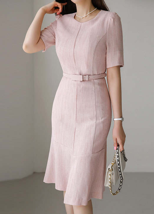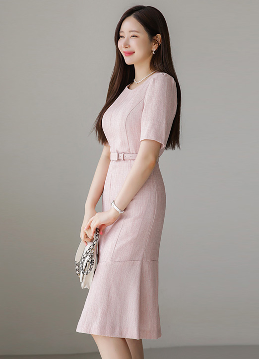Flare Hem Paneled Slim Tweed Dress w/ Belt