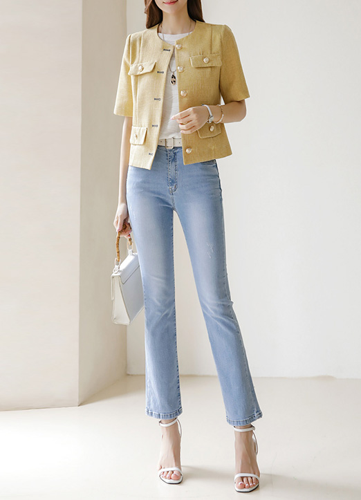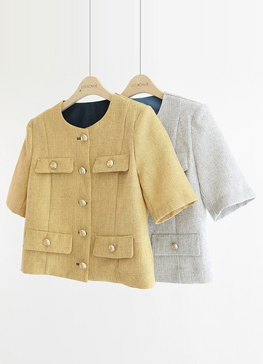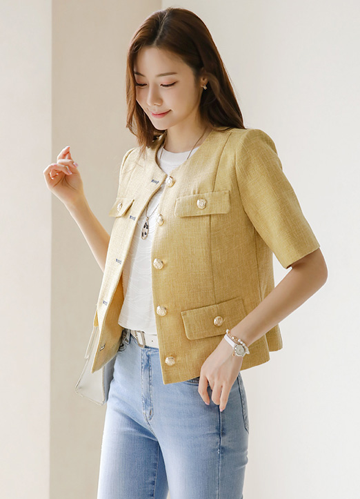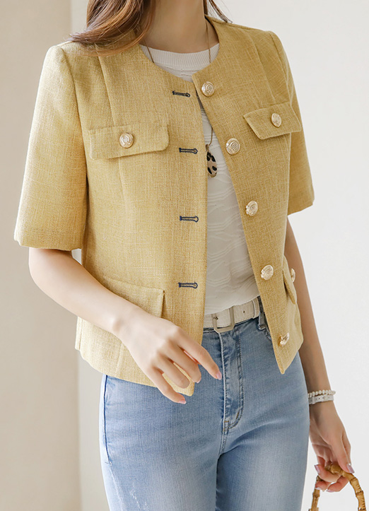 Collarless Fake Pocket Gold Button Semi Crop Jacket