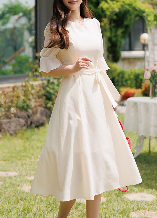 (Louis Angel) Elegant Self-Belted Chiffon Sleeve Flare Dress