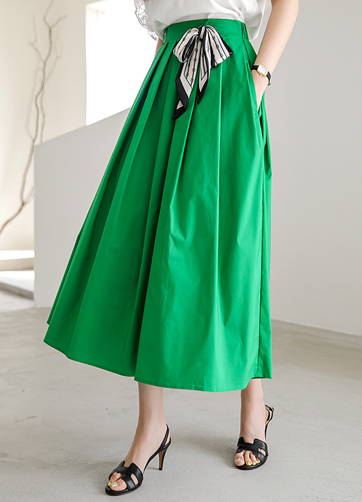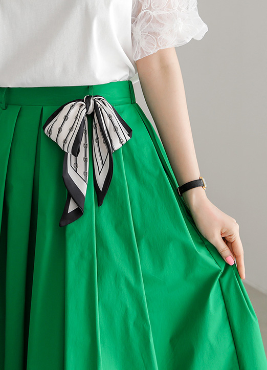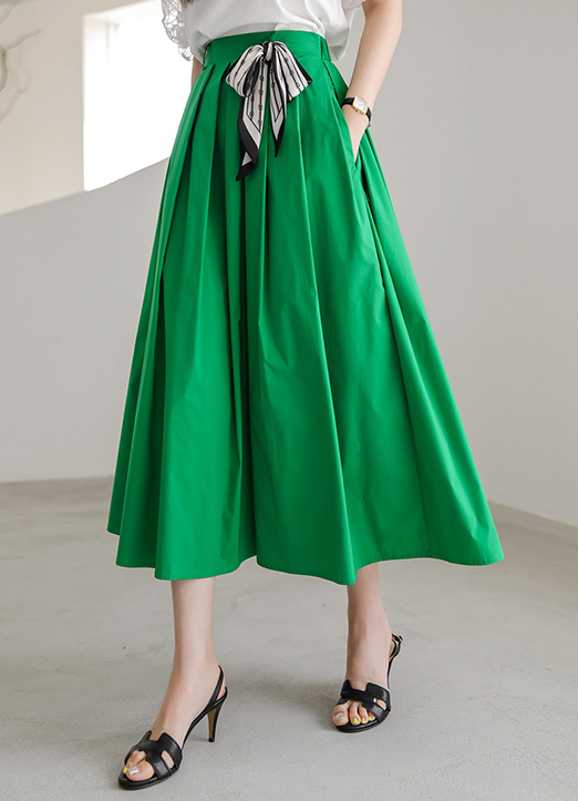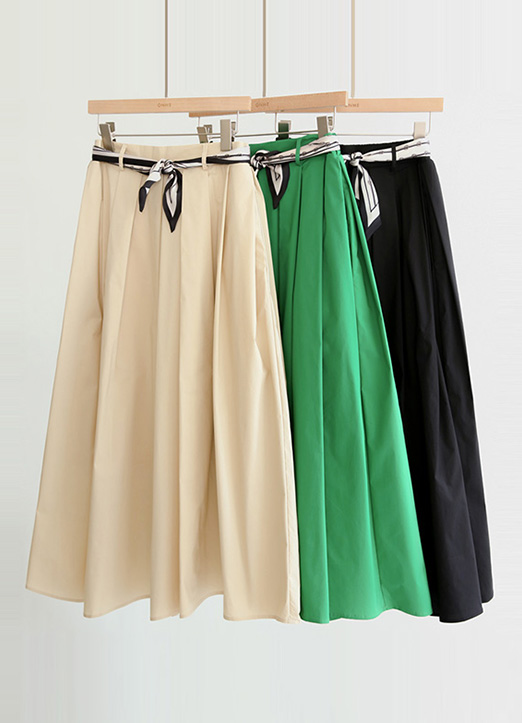 Elastic Back Waist Pleated Skirt w/ Scarf Belt