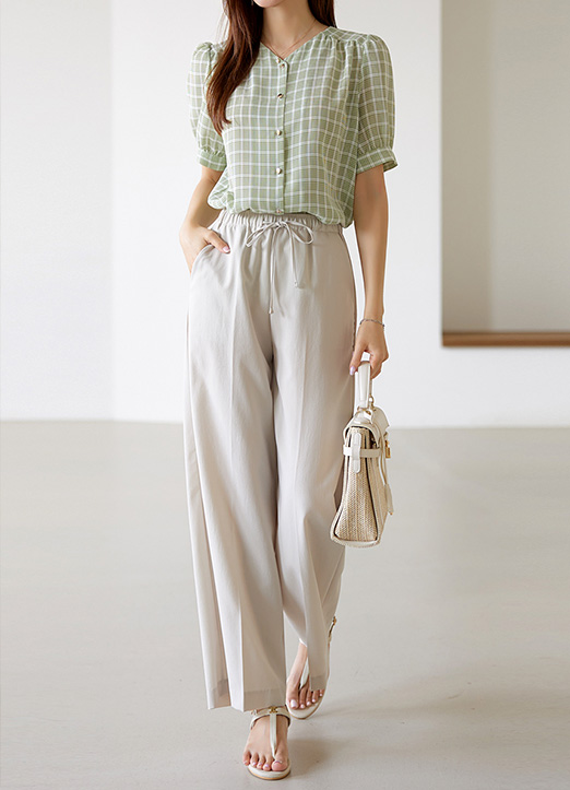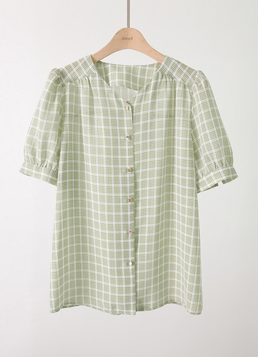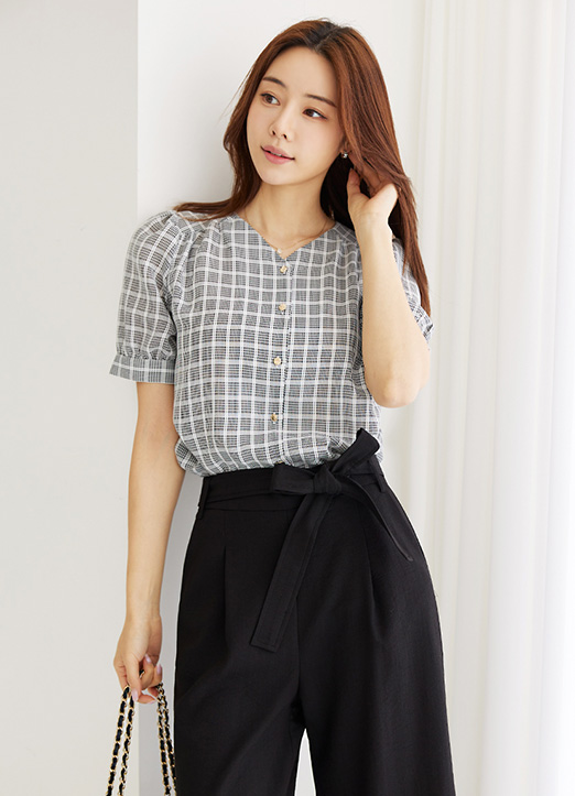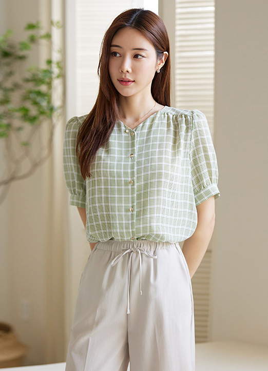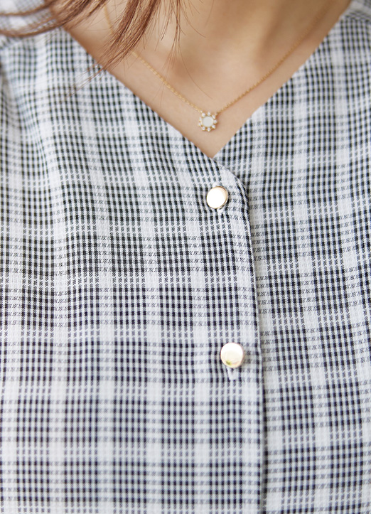 [Louis Angel] Collarless V-Neck Check Print Shirring Blouse