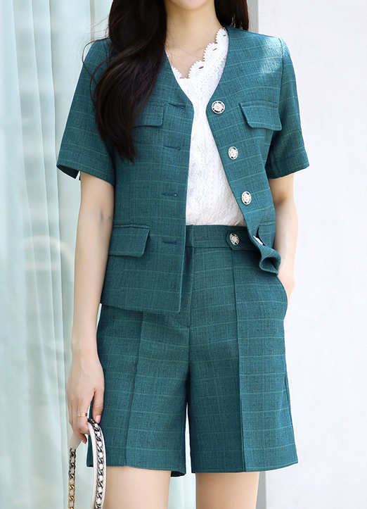 [루이스엔젤] 버블린 은은한체크 비조 버튼 절개 4부 팬츠