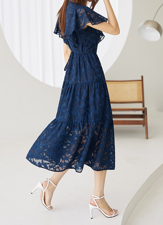 [Louis Angel] Ruffle Sleeve Tie-Waist Tiered Floral Lace Dress