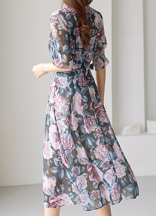 [Louis Angel] Striking Pink Rose Floral Self-Belted Pleats Chiffon Dress