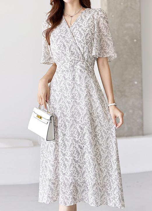 Ethnic Leaf Tie-Waist Wrap Design Flare Chiffon Dress