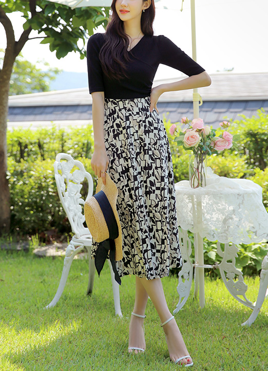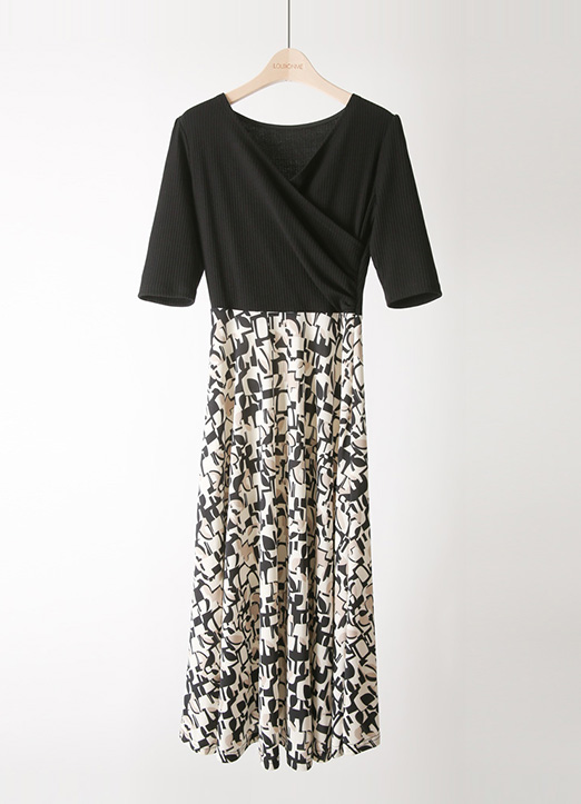 [Louis Angel] Mixed Media Ribbed Top Contrast Geo Pattern Dress