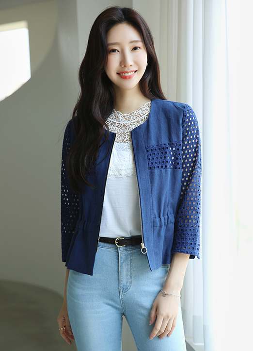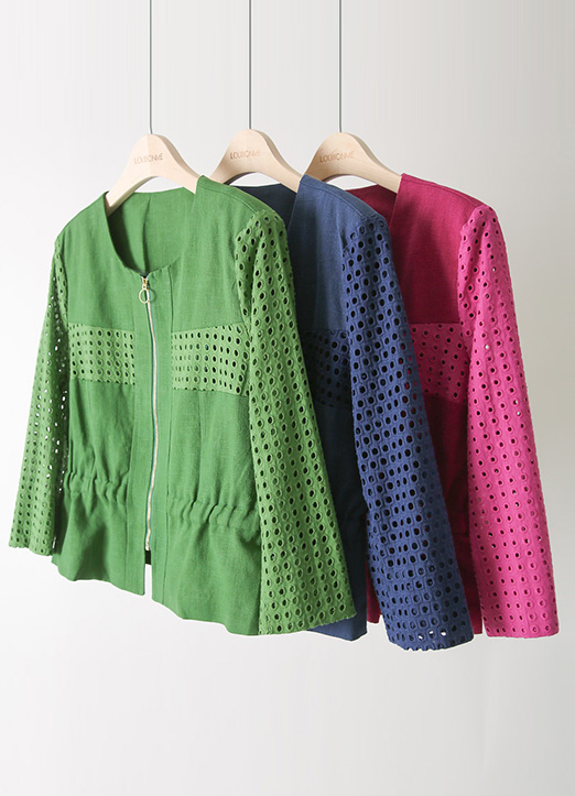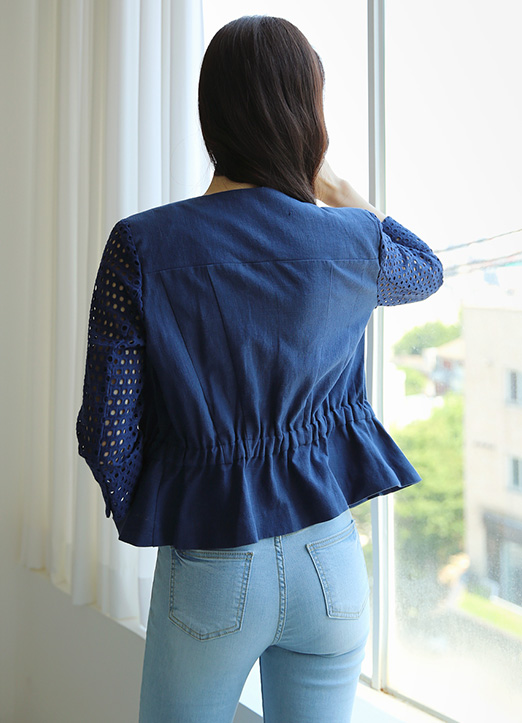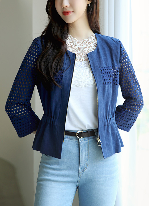 Eyelet Block Elastic Waist 3/4 Sleeve Zip-Up Linen Jacket