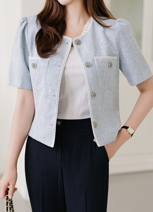 Braided Trim Puff Short Sleeve Summer Tweed Jacket
