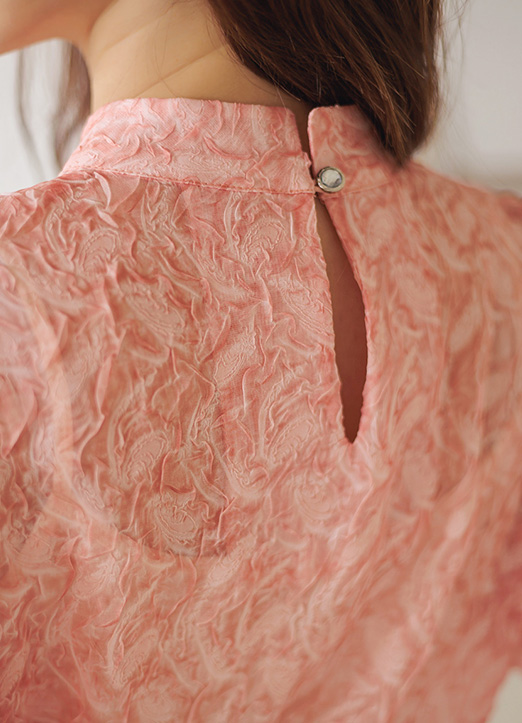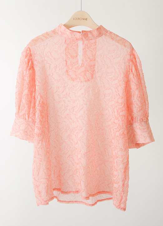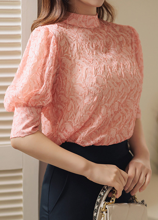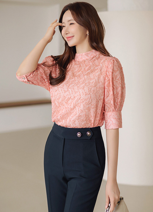 [Louis Angel] Mock Neck Embossed Wrinkle Jacquard Blouse