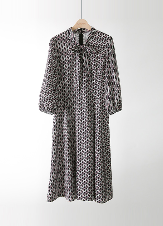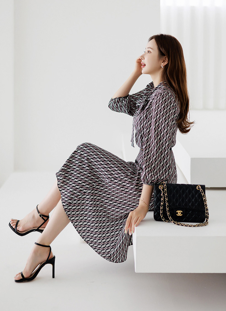 [Louis Angel] Geo Print Tie-Neck 3/4 Sleeve Flare Dress