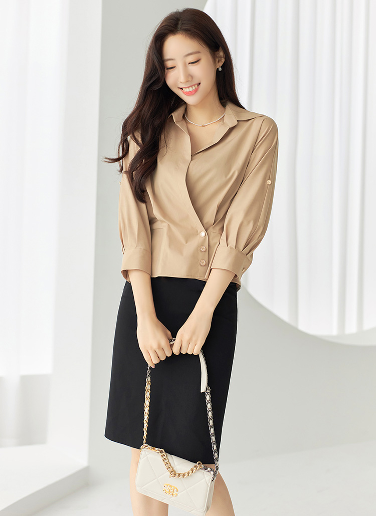 [Louis Angel] Roll-Up Sleeve Shirred Back Wrap Blouse