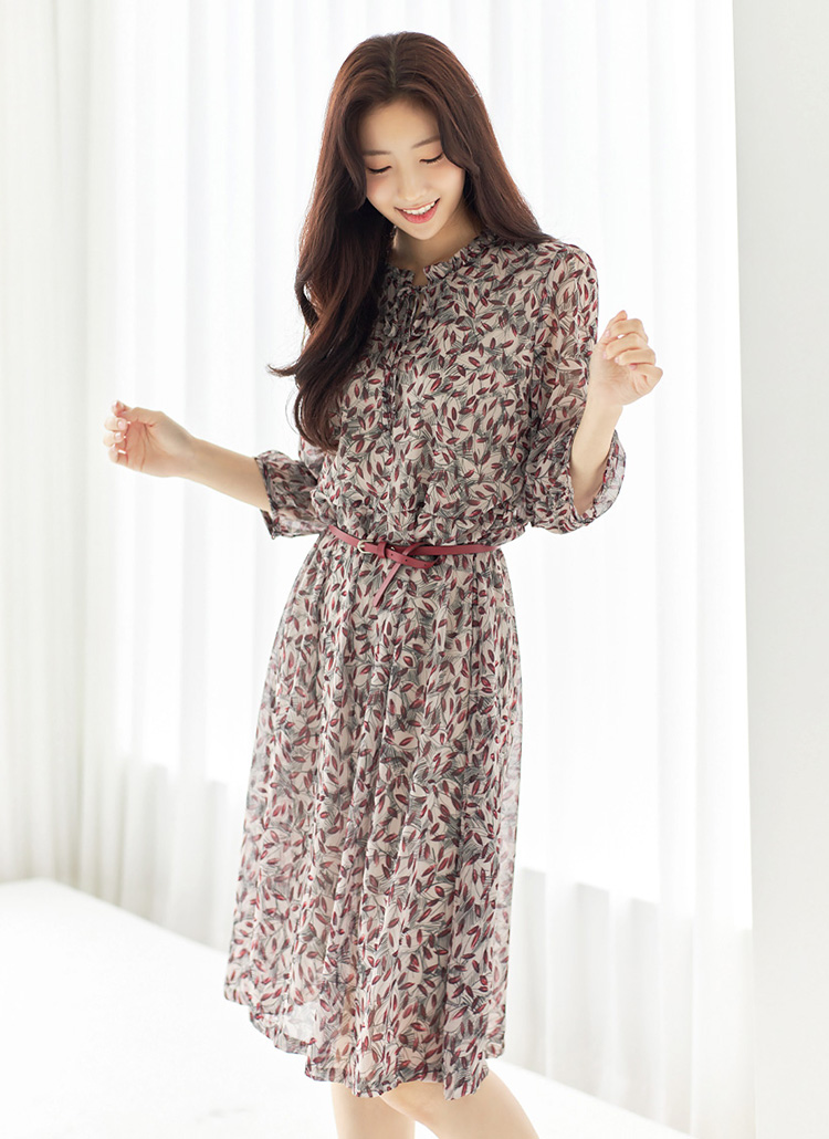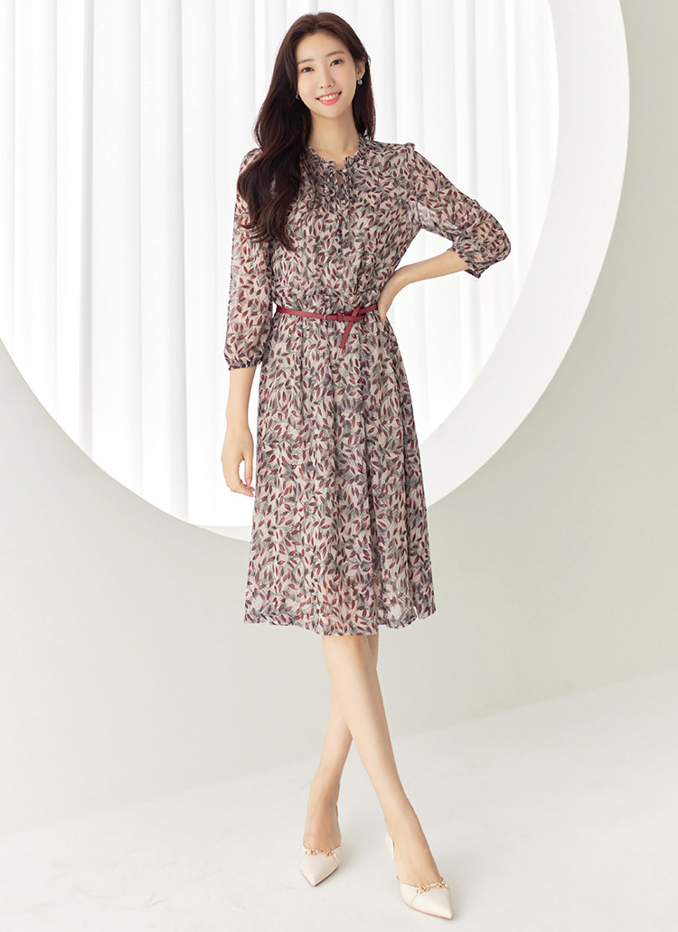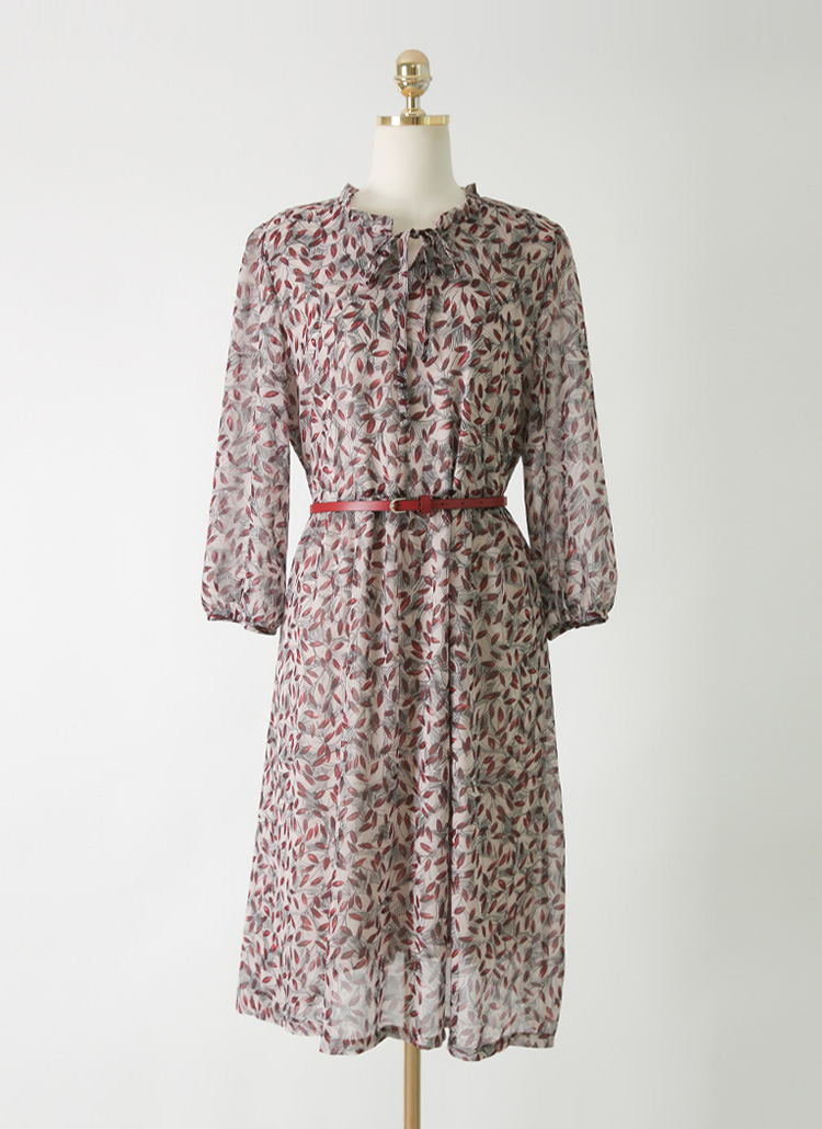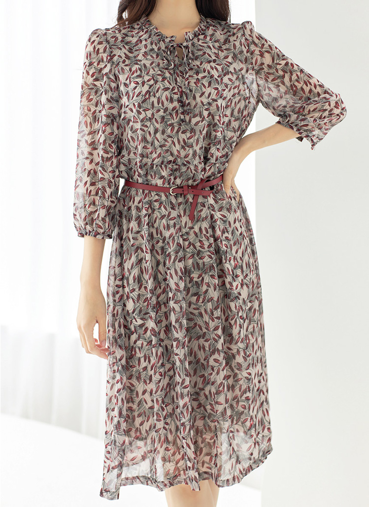 Red Leaf Print Frilled Tie-Neck Chiffon Flare Dress w/ Belt