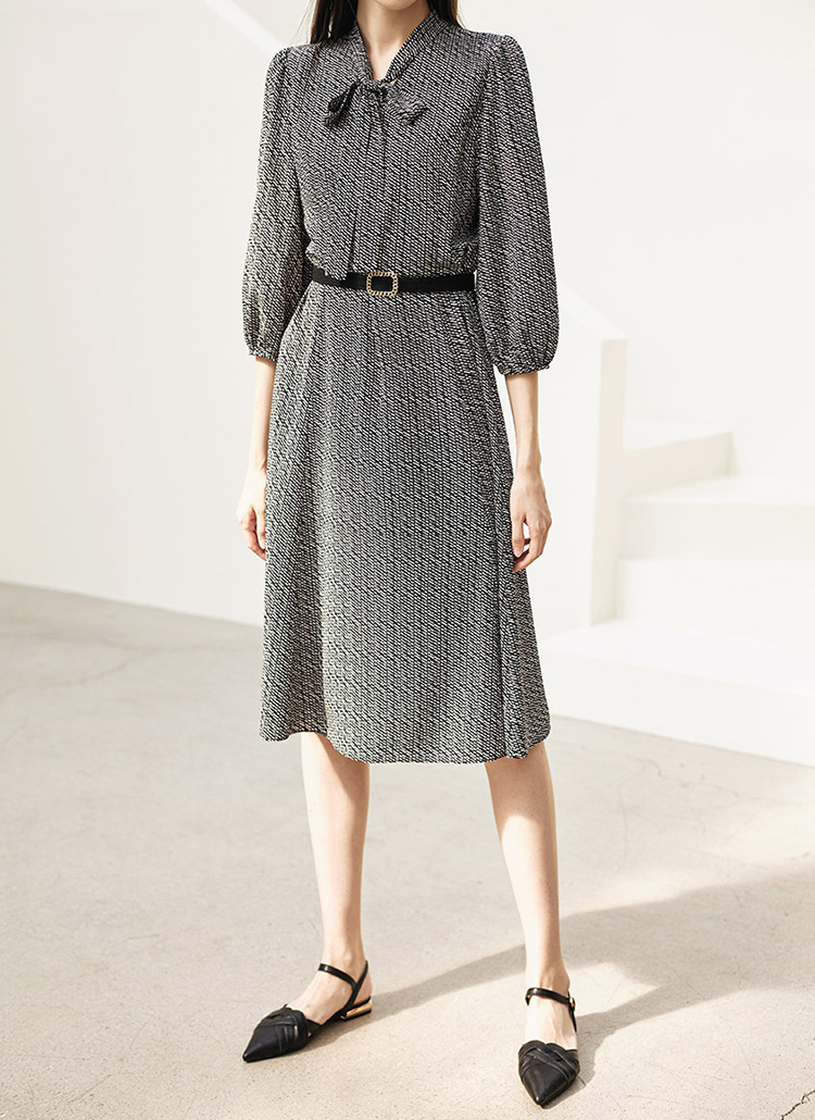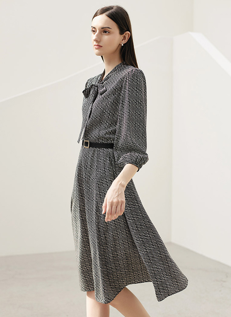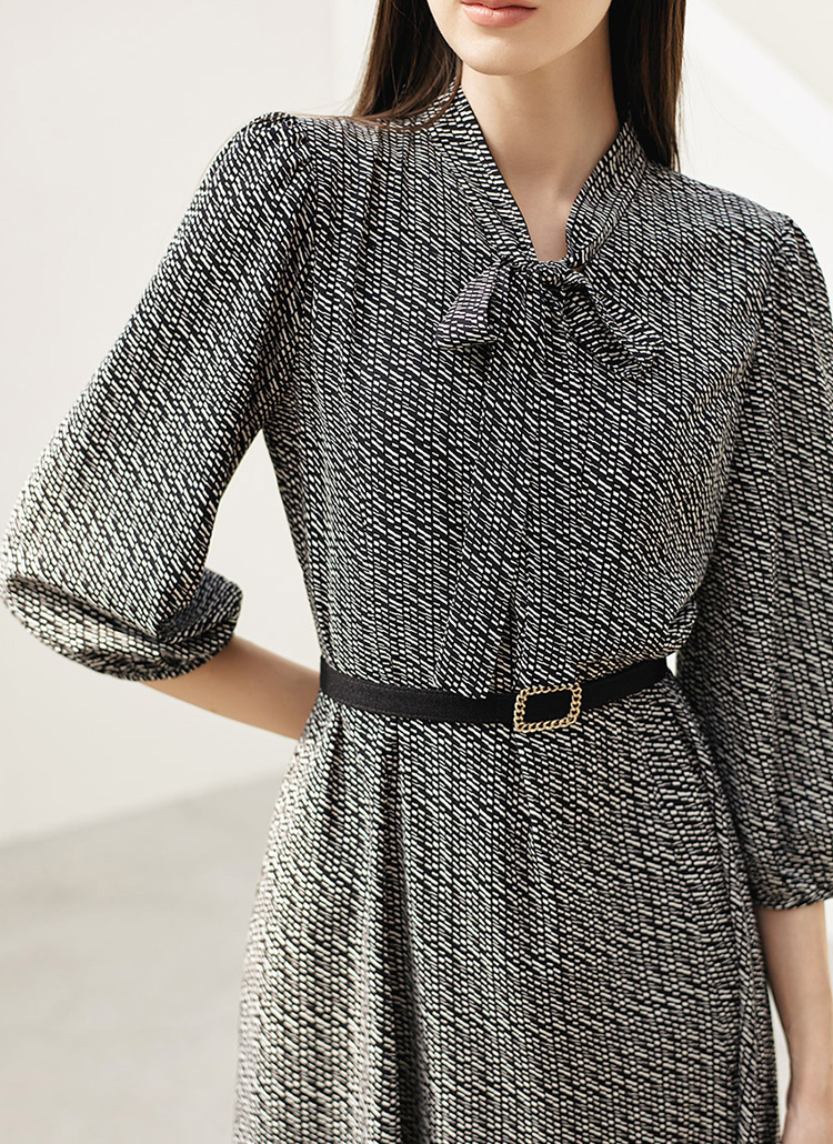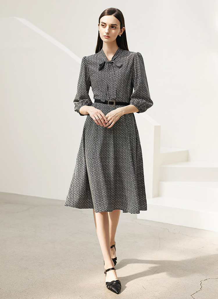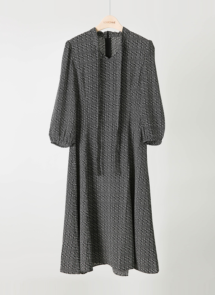 [The Onme] Black & White Geo Print Tie-Neck Flare Dress