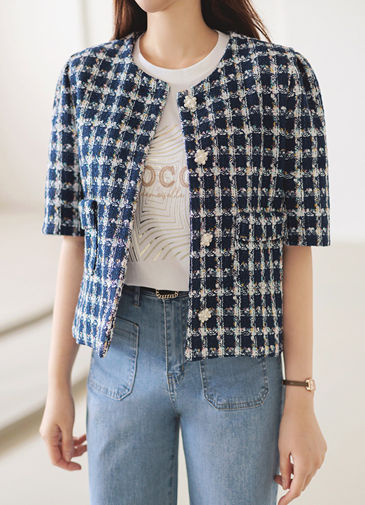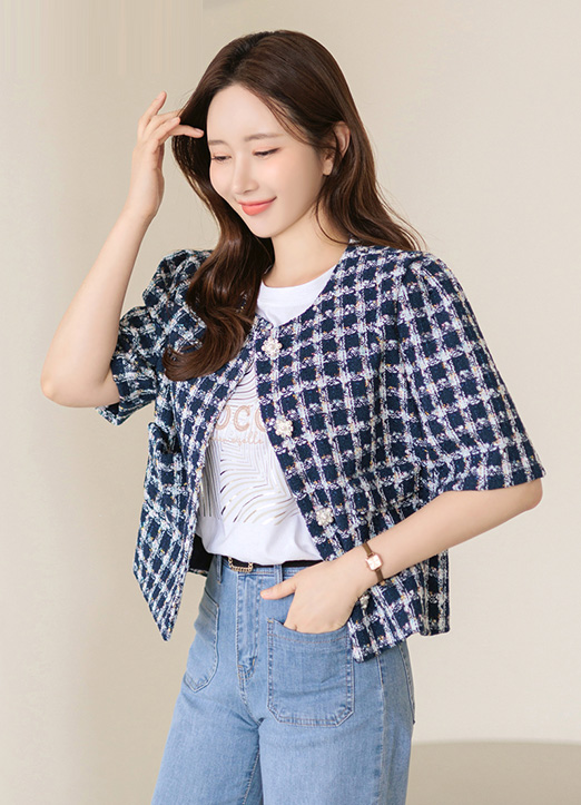 Jewel Button Puff Half Sleeve Metallic Tweed Jacket