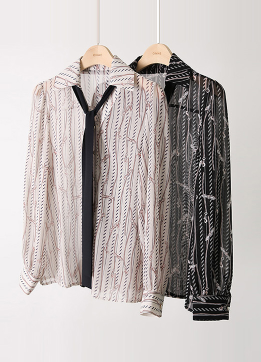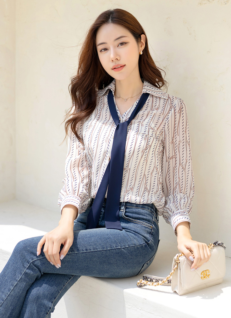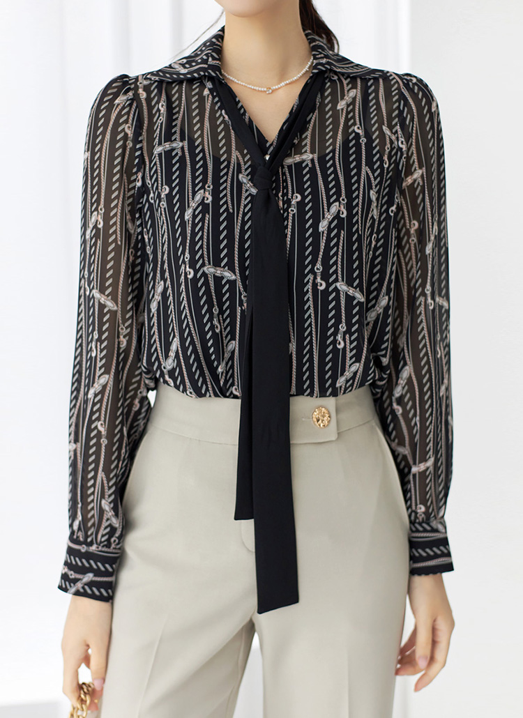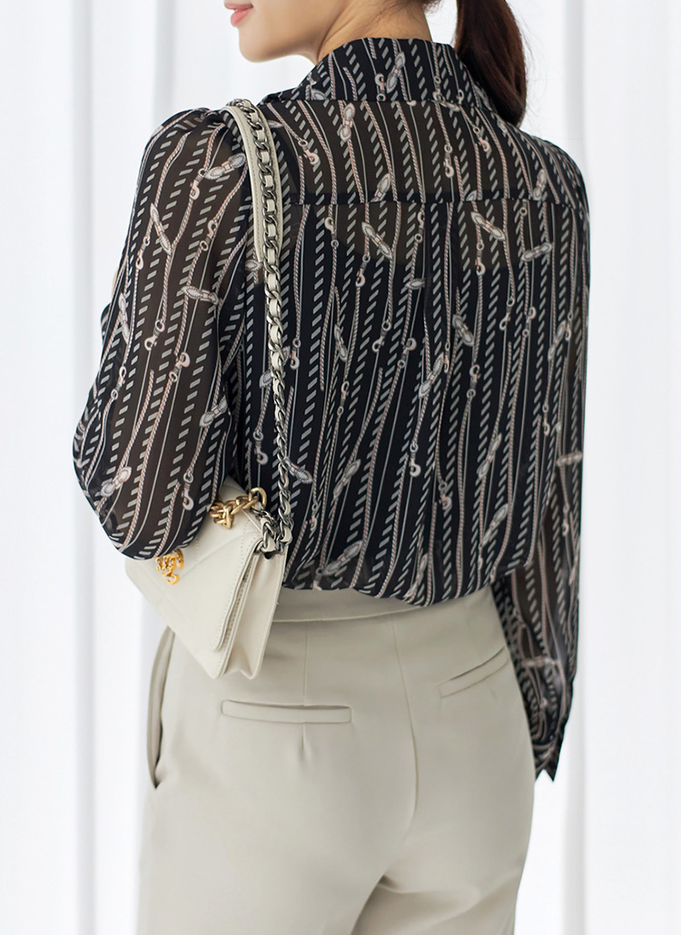 [Louis Angel] Chain Print V-Neck Collared Chiffon Blouse w/ Tie
