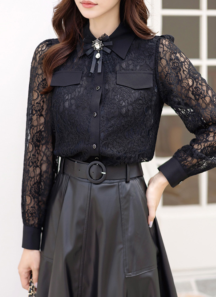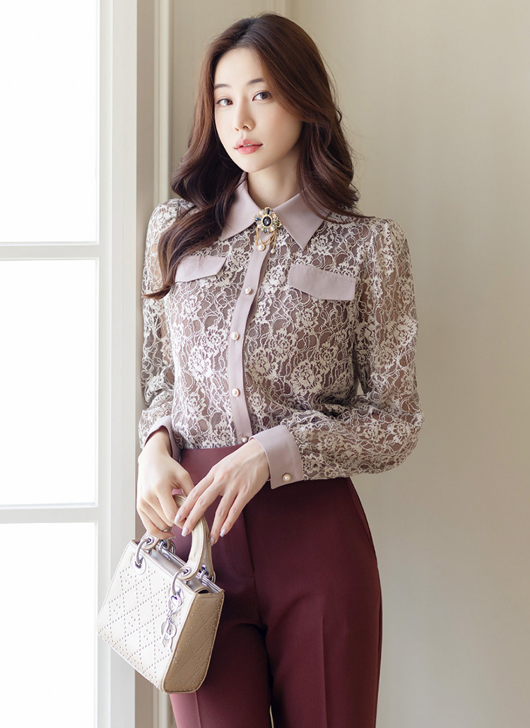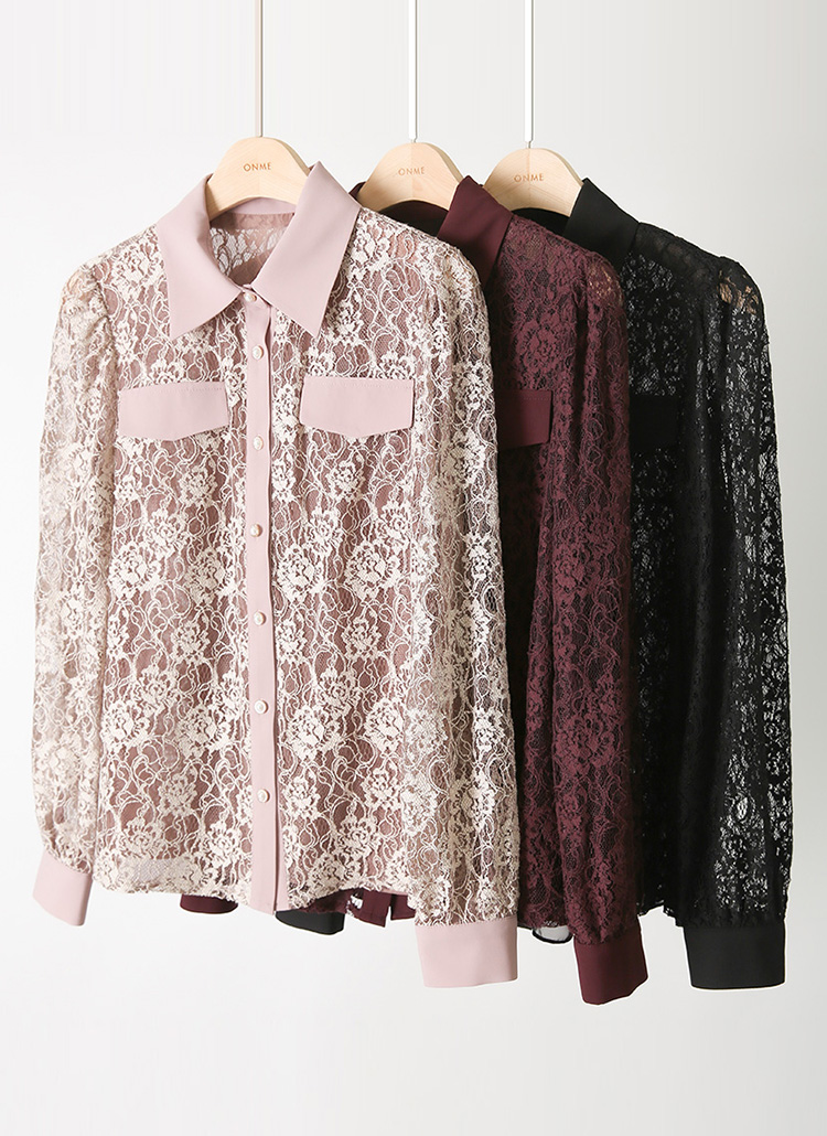 [Louis Angel] Contrast Trim Collared Two-Tone Floral Lace Blouse