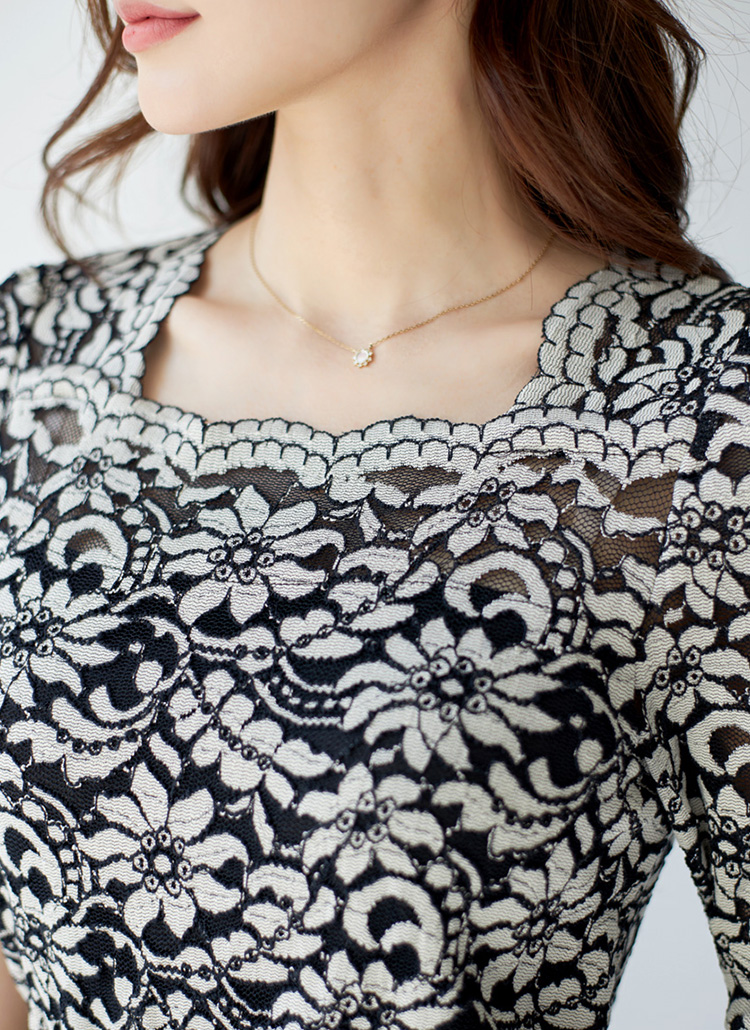 [Louis Angel] Scallop Trim 3/4 Sleeve Two-Tone Floral Lace Top