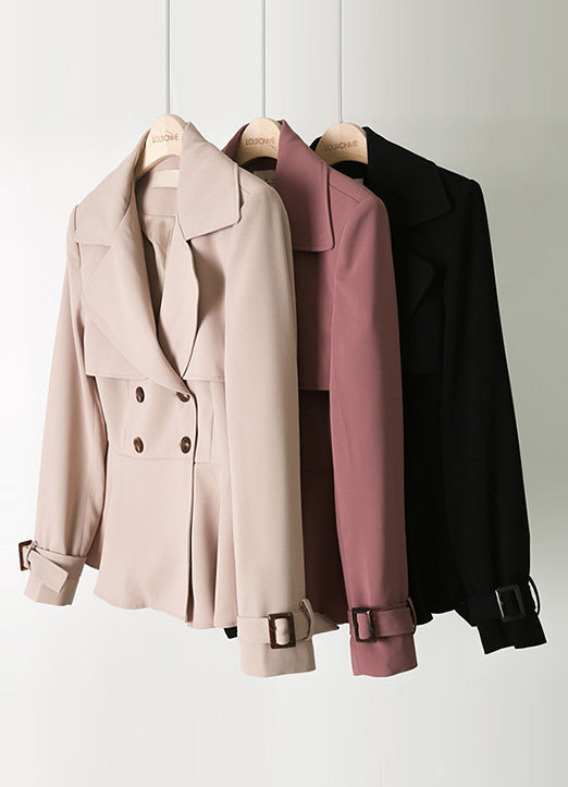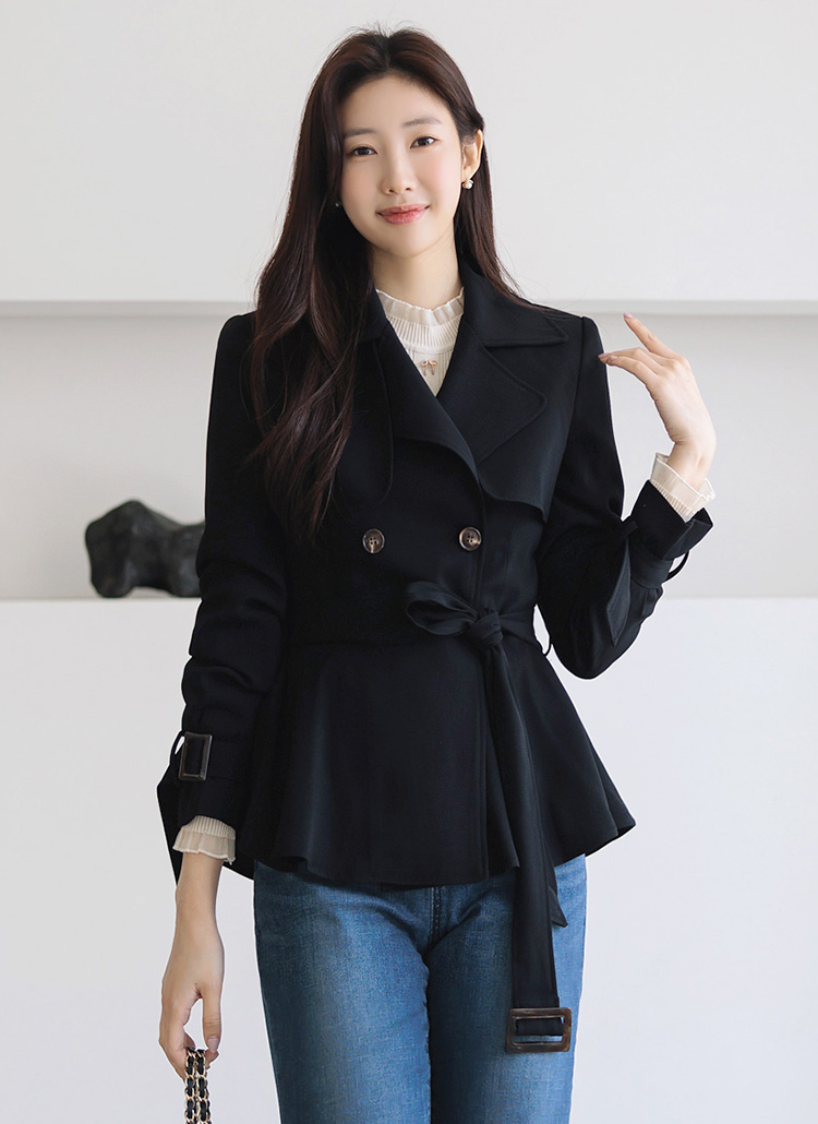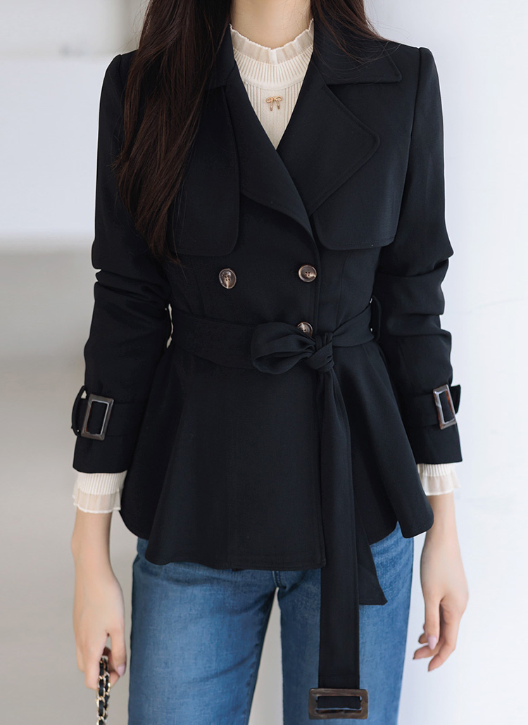 Double Breasted Self-Belted Flared Hem Short Trench Jackegt