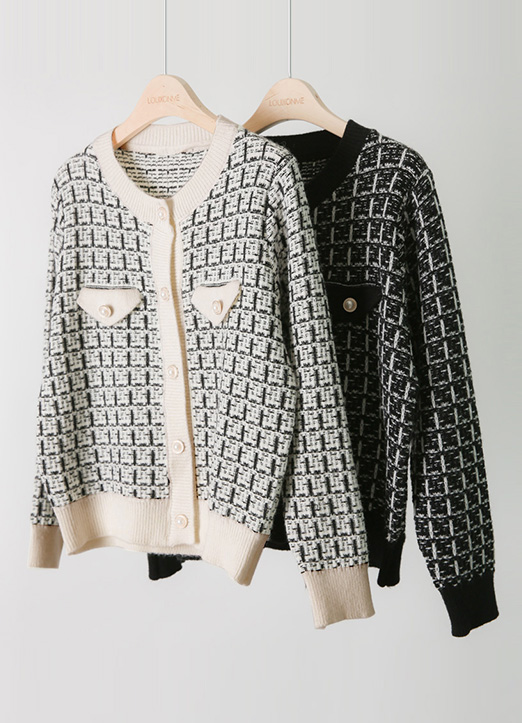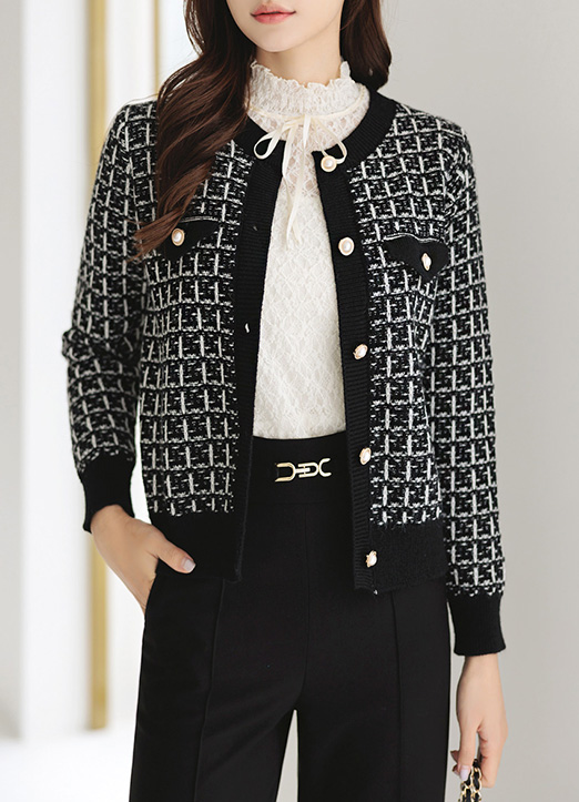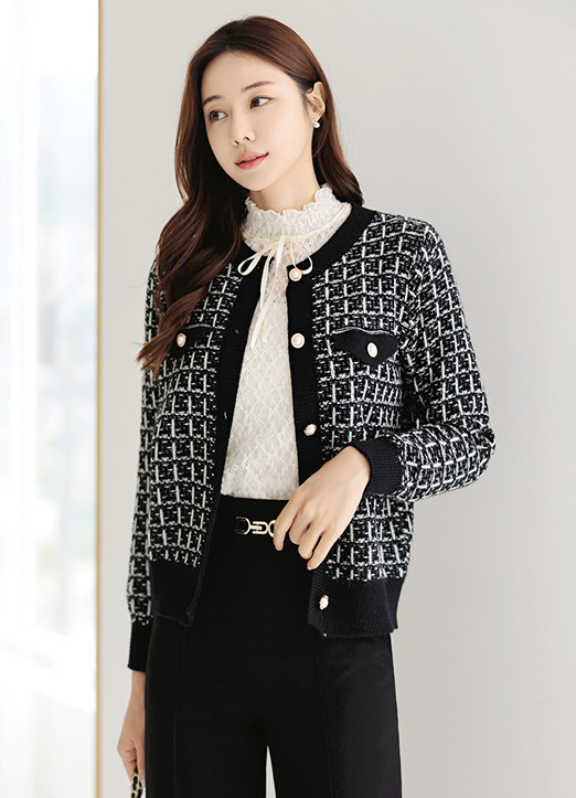 볼드한 진주버튼으로 화사한 포인트를 준 니트 가디건이에요 :)