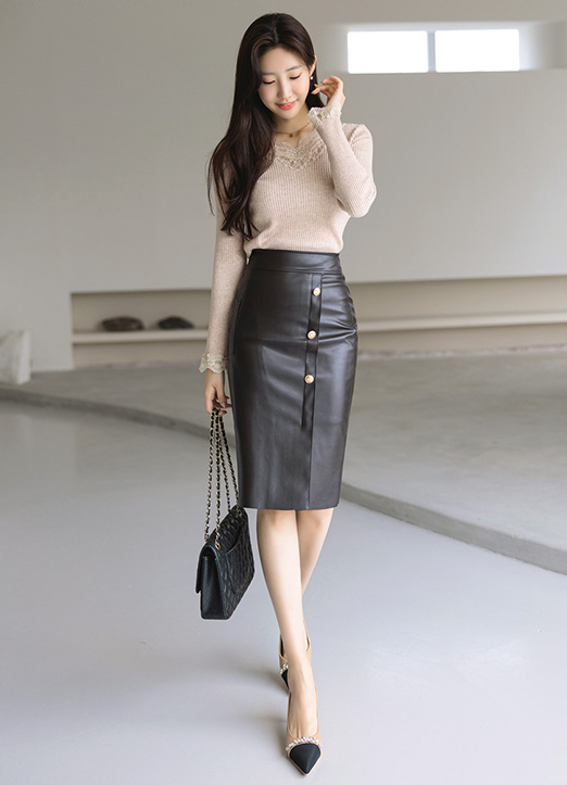 밑단 트임 디테일이 더해져 걷거나 앉는데에도 불편함없이! 입기 좋은 레더 스커트에요