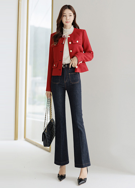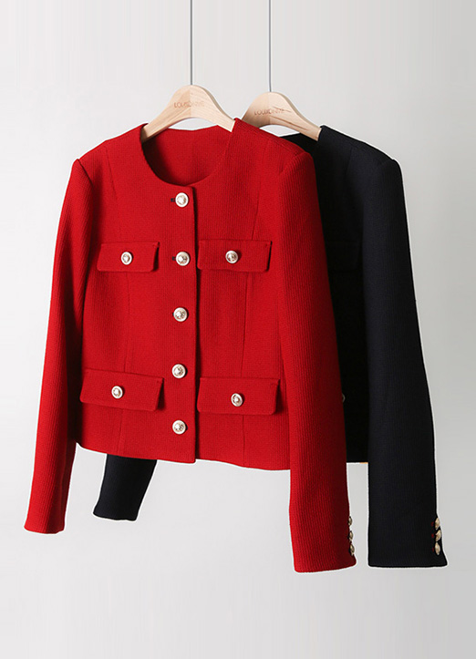 볼드한 골드버튼과 버튼라인에 배색 스티치를 더해