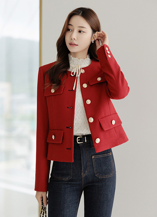 포인트 레드 컬러가 얼굴을 맑고 화사하게 밝혀주는 톤이며