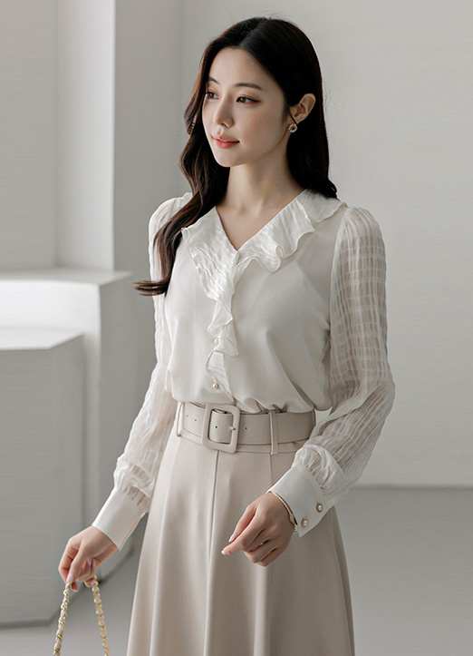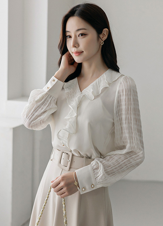 Y넥으로 흐르는 프릴 사이로 진주 단추를 매치해주어