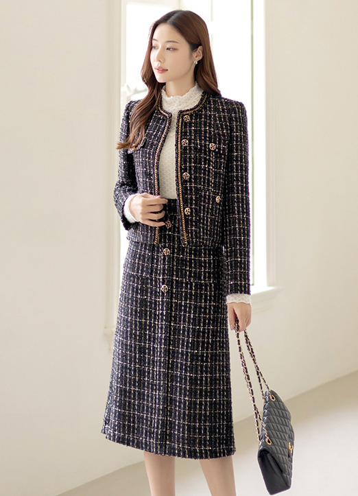 [LouisAngel] Chain Trimmed Collarless Plaid Tweed Jacket