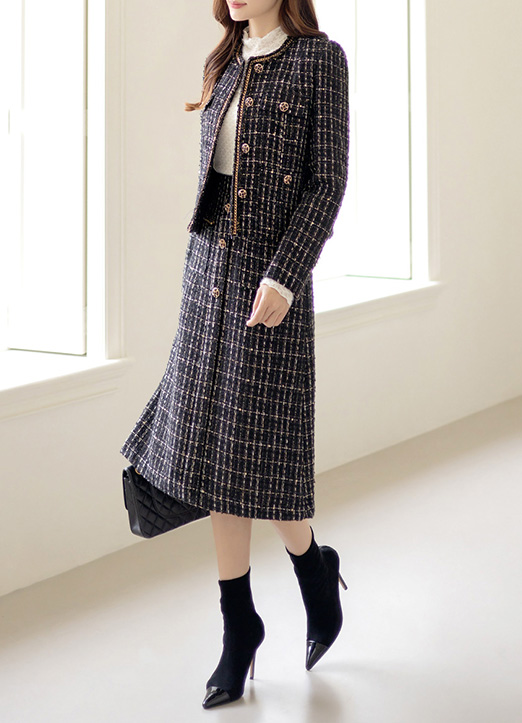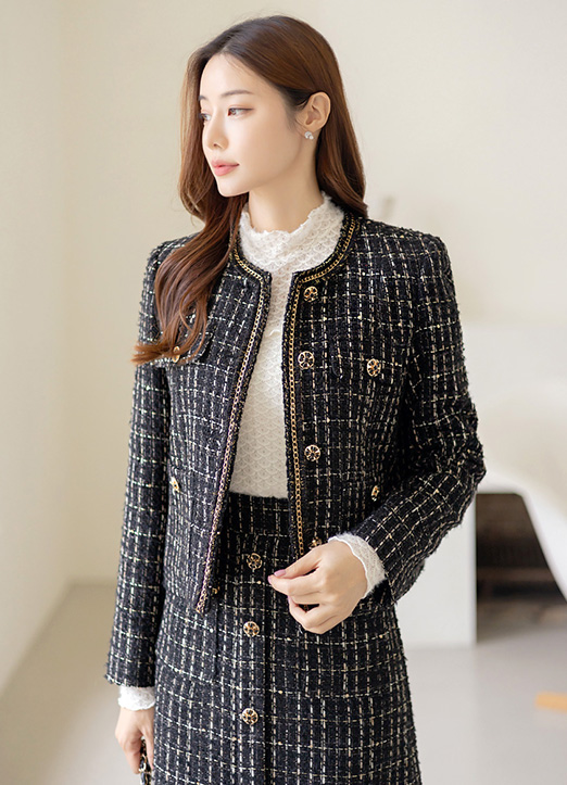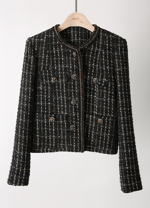 [LouisAngel] Chain Trimmed Collarless Plaid Tweed Jacket