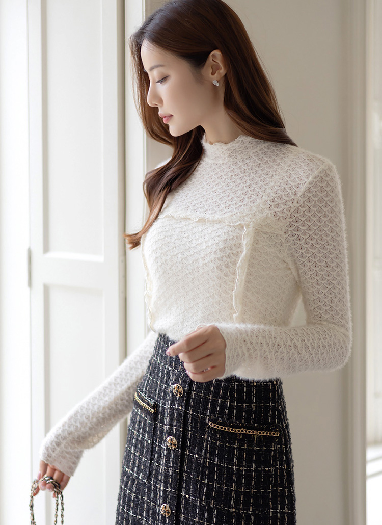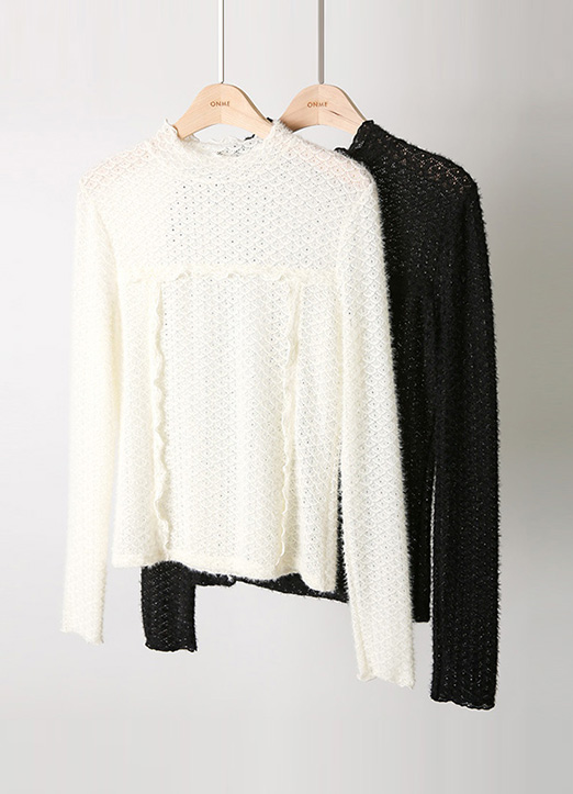 [LouisAngel] Curly Mock Neck Ruffle Detail Brushed Lace Top