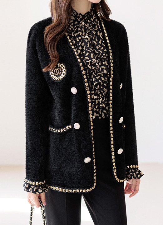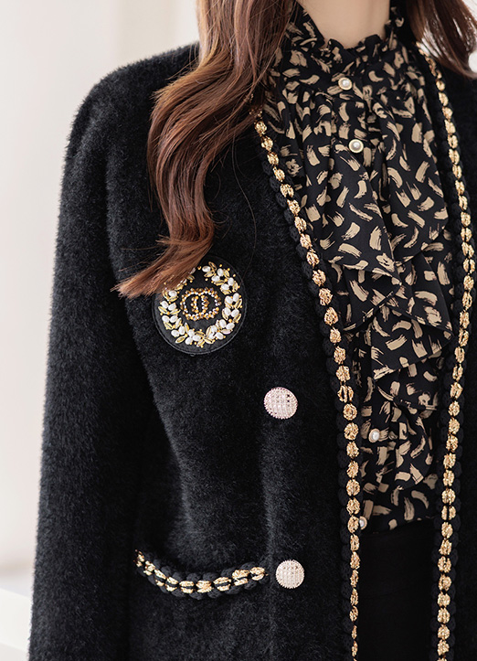 Gold Braided Trim Open Front Fuzzy Cardigan